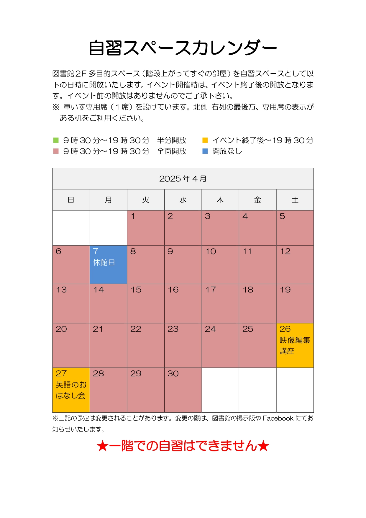変更の際は、図書館のホームページやFacebook、館内掲示板でお知らせいたします。
