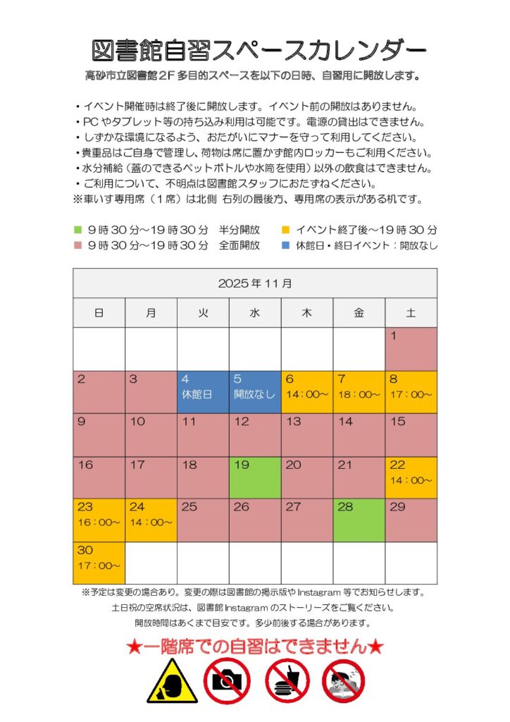2025年11月の自習スペースの開放予定を掲載いたします。