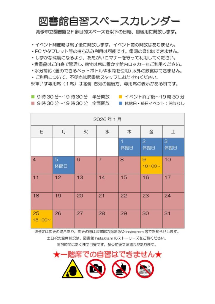 2026年1月の自習スペースの開放予定を掲載いたします。