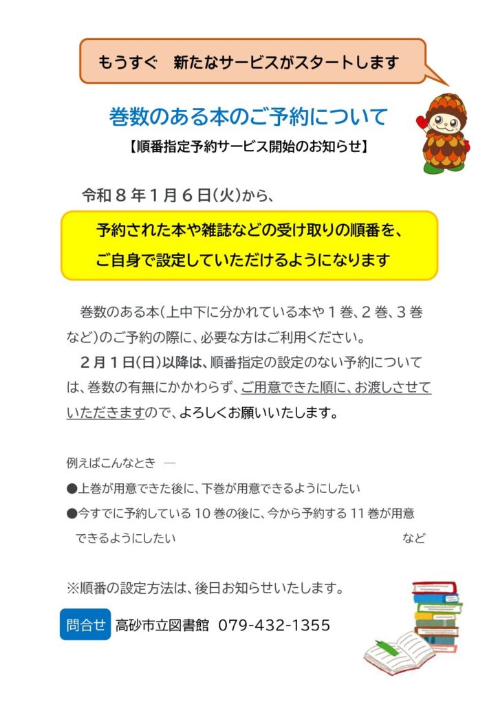 2月1日(日)以降は、順番指定の設定のない予約については、巻数の有無にかかわらず、ご用意できた順にお渡しさせていただきますのでよろしくお願いいたします。