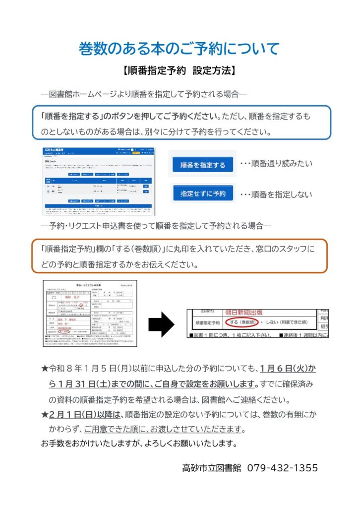 ※令和8年1月5日(月)以前に申込した分の予約についても、1月6日(火)から1月31日(土)までの間に、ご自身で設定をお願いします。ご自身の「予約一覧」から設定資料を選択し、「順番を指定する」ボタンを押して設定できます。すでに確保済みの資料の順番指定予約を希望される場合は、図書館へご連絡ください。