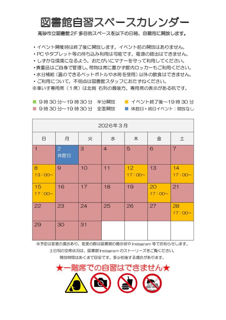 2026年3月の自習スペースの開放予定を掲載いたします。